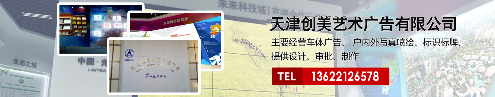 天津創美藝術廣告有限公司主要經營車體廣告、 戶內外寫真噴繪、標識標牌、提供設計、審批、制作、發布的服務。